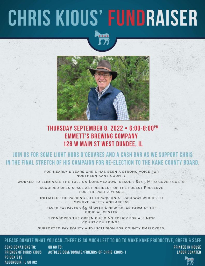 Please come and join us at Emmett’s Brewing Company on Thursday, September 8, 2022 at 6pm for light hors d’oeuvres and a cash bar to support Chris Kious in the final stretch of his re-election campaign. There’s so much more left to do to make Kane productive, green, and safe!